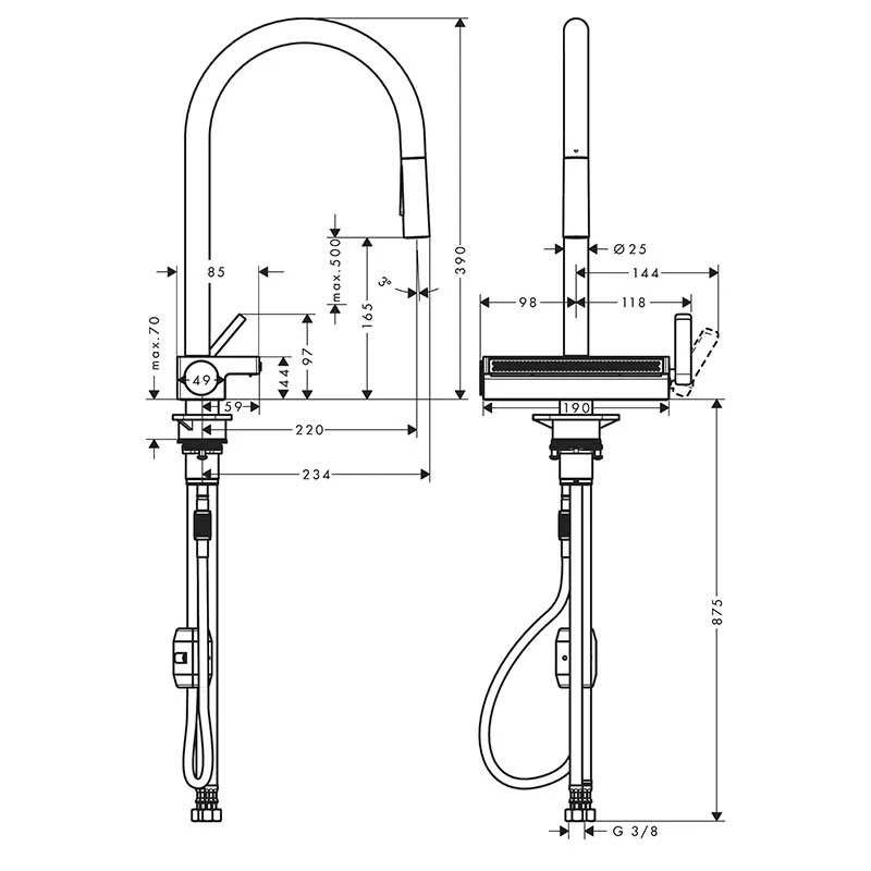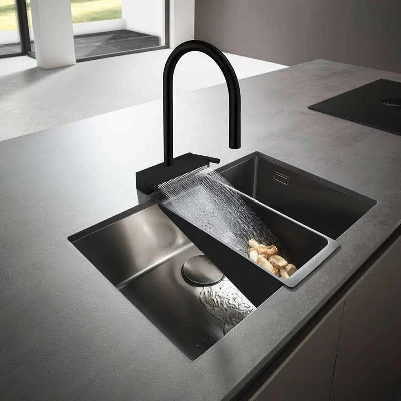The hansgrohe Aquno also features a LaminarSpray, ShowerSpray and SatinFlowSpray. The LaminarSpray is a crystal-clear spray type with no added air for the sink. This spray is a great help when going through the day-to-day kitchen routine, e.g. quickly filling large pots or bowls. Efficient with very little splashback. The ShowerSpray has a soft spray which helps to gently yet efficiently clean food and other items. The SatinFlowSpray is a micro-fine, resource-saving spray type that can be used to clean sensitive foods extremely gently. The wide water spray flows from the base of the tap, causing very little splashback in the sink.